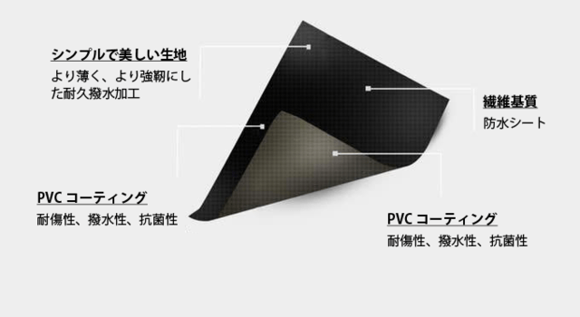 また、素材選びにも徹底的にこだわり、4層構造のハイテク素材により、防水機能をはじめ、防汚、衝撃吸収、UV保護、耐寒性、難燃性、耐傷性、抗菌性を実現しています。