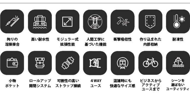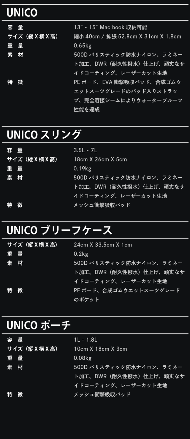 Unicoは、防水機能をはじめとする多様な機能と、付属のポーチ、スリングバック、スリーブバックを利用シーンによって使い分ける可変性により、日常生活からアクティブユースまで様々な場面で利用することが可能な多機能バックです!