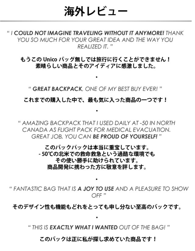 Unico Bagは、イタリアの研究開発チームによって制作されました。CEOのJacopoはデザイナーとして数十年のキャリアを持ち、パートナーのSergioは繊維メーカーにて生地の開発を行ってきました。