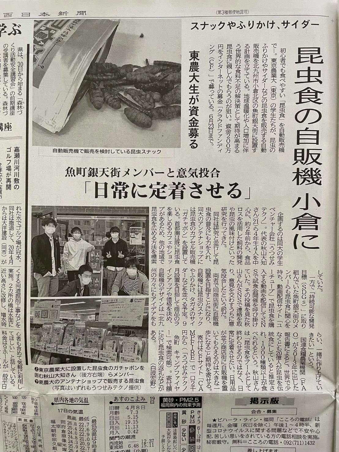 また、販売については、既に販売実績のある東京農業大学内・生協様や道の駅かぞわたらせ様を始め、2021年4月にオープンしたばかりのECサイト「うつせみAgri-Port」を予定しています。特に昆虫自動販売機による展開を検討しており、ご支援が頂けましたらその第一弾として北九州市小倉にあるSDGs商店街こと「魚町銀天街」に設置することになっています。商店街の皆様とはこれまでも交流させて頂いており、自動販売機の装飾や設置時には商店街を中心に地域社会の方を巻き込んだイベントも同時に開催したいと考えています!