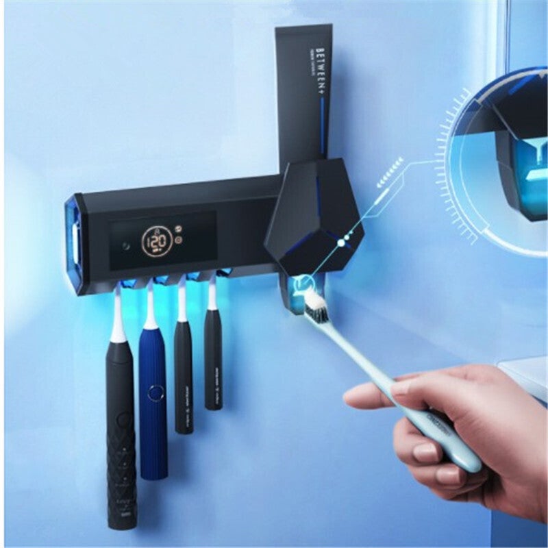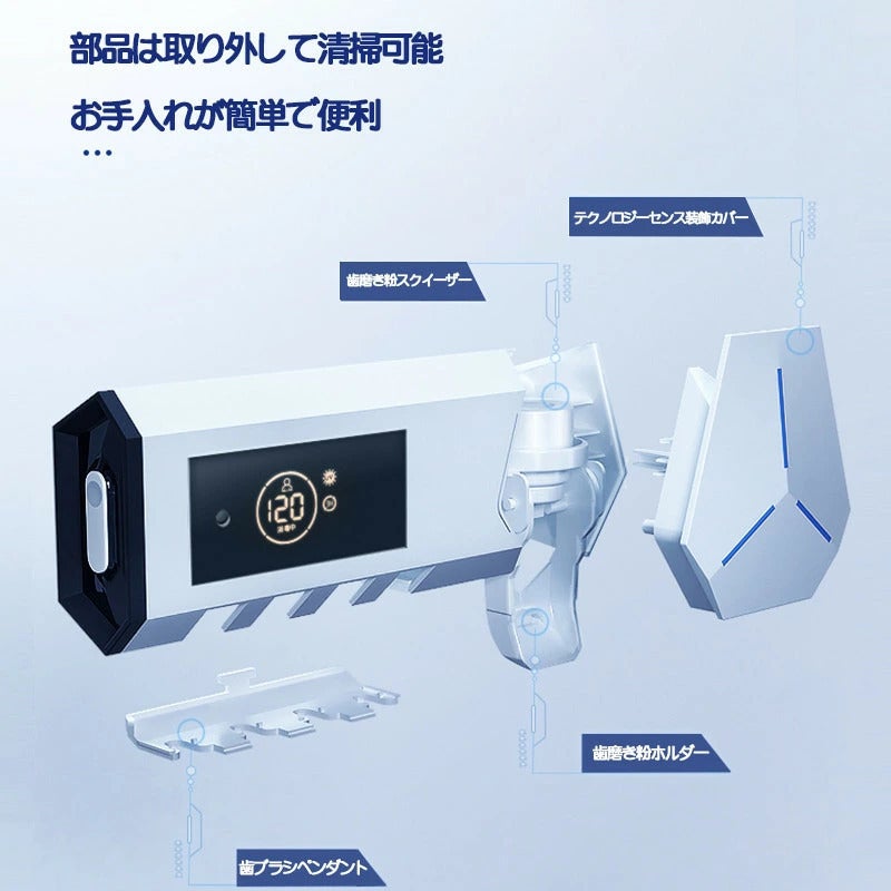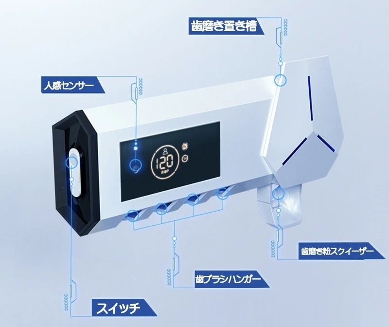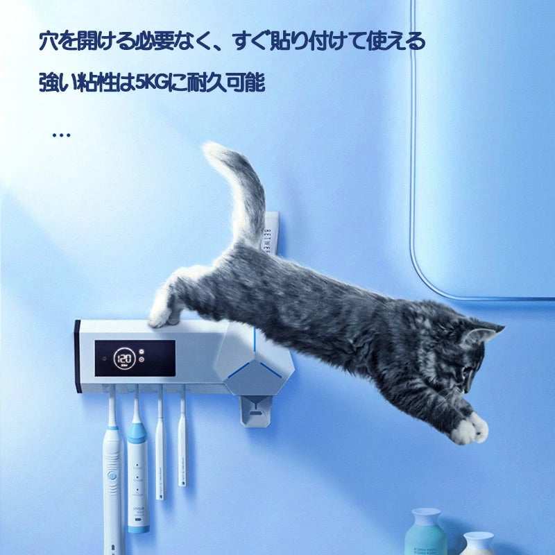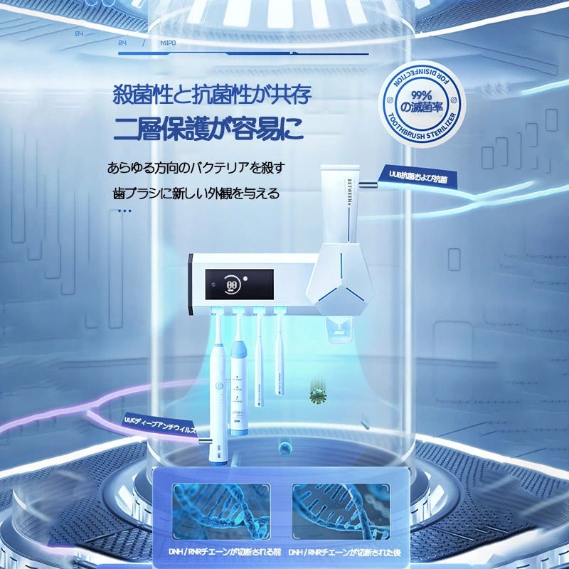 UV-C紫外線+ブルーライト光触媒によるダブル除菌で、除菌率は99%。さらには歯磨き粉ディスペンサーを搭載。除菌のみならず洗面所周りをスッキリ収納できるような設計!