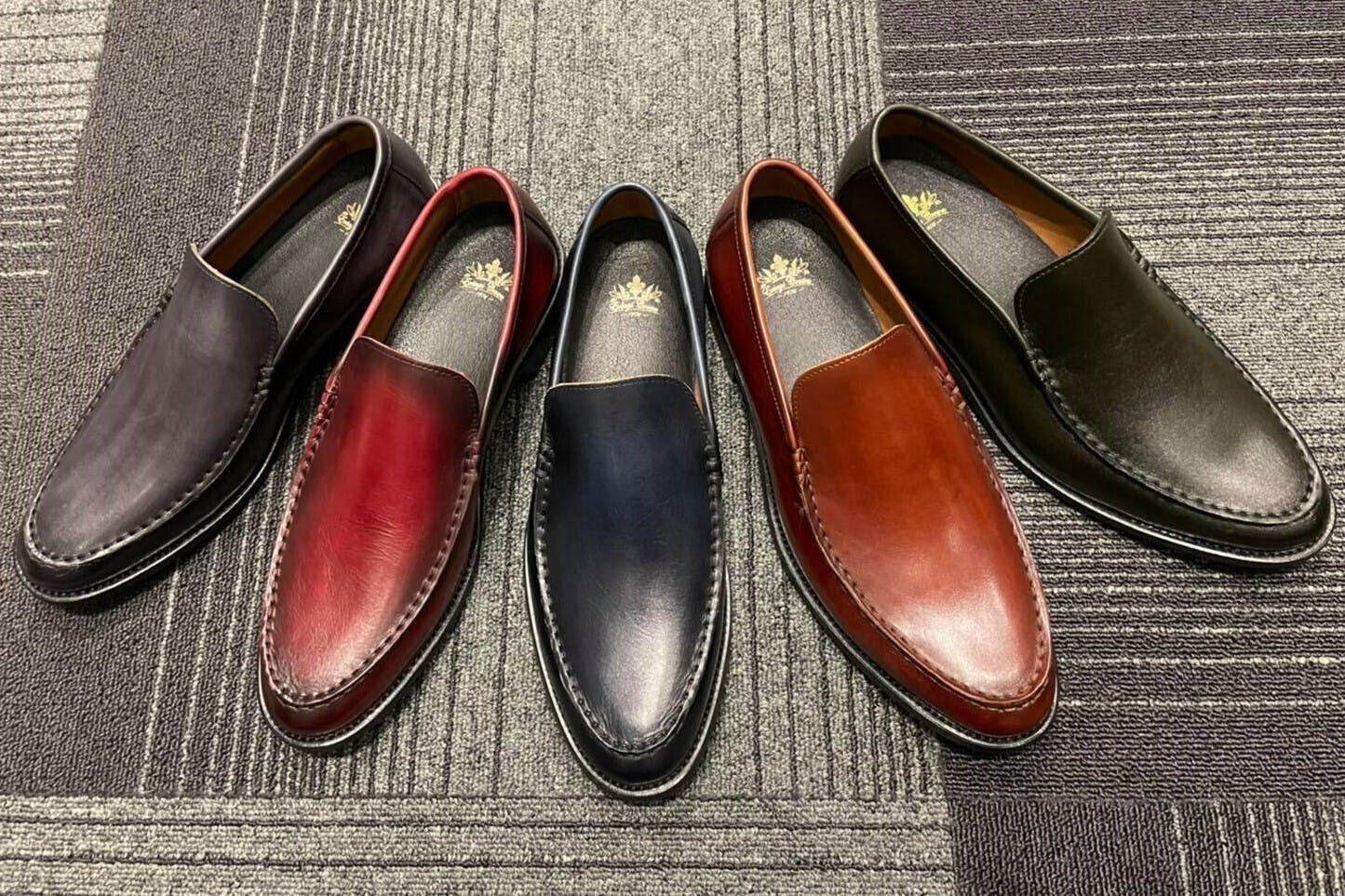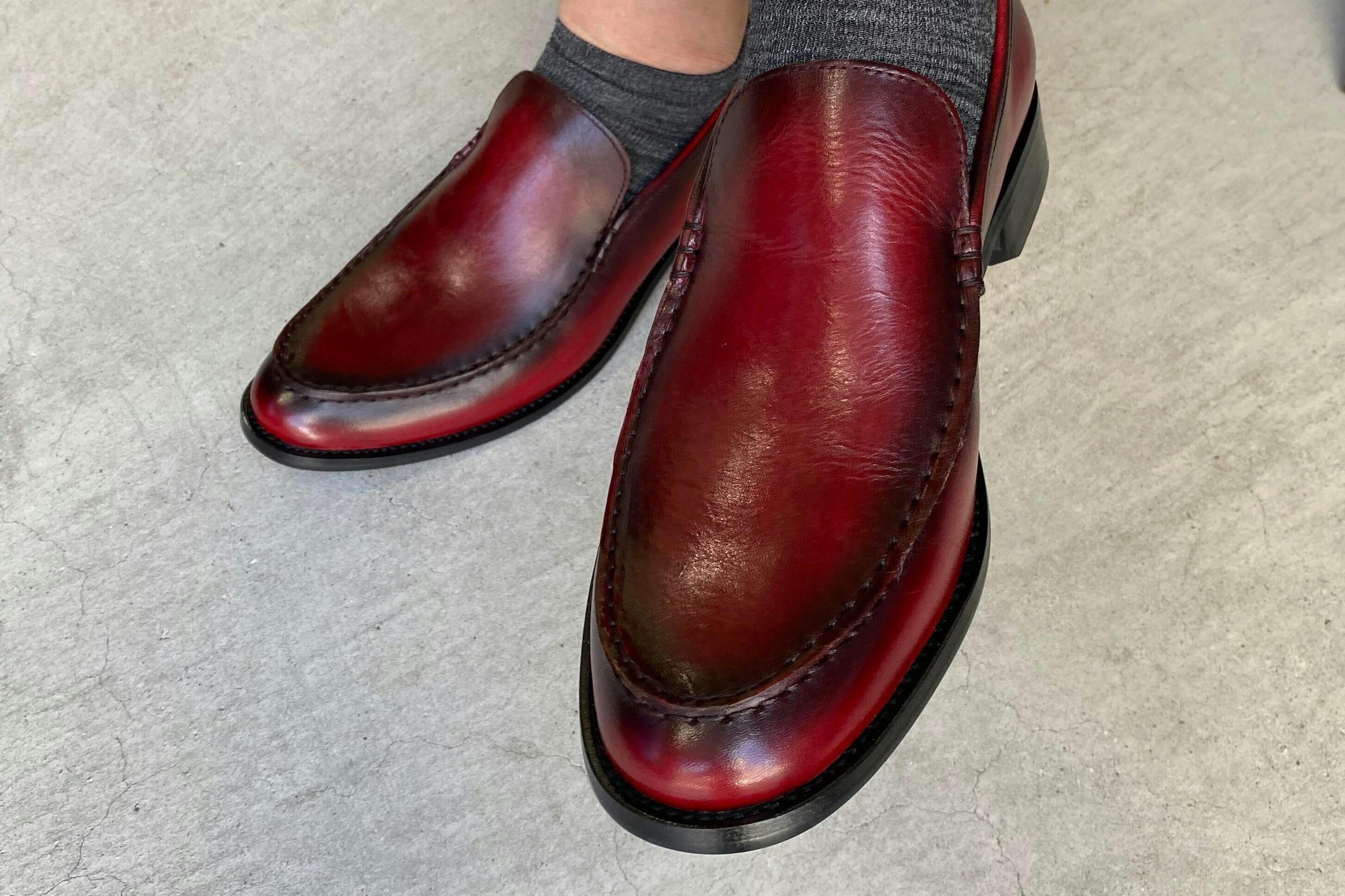 一足一足職人が手作業で染め上げていくので、二つとして同じ色合いの靴はありません。加えて履きこんでいくうちに風合いが少しずつ変わり、真に自分だけの一点モノに育っていく。購入時の美しい色合いが履くことでより美しく変化する過程を、ぜひ楽しんでいただけたらと思います。
