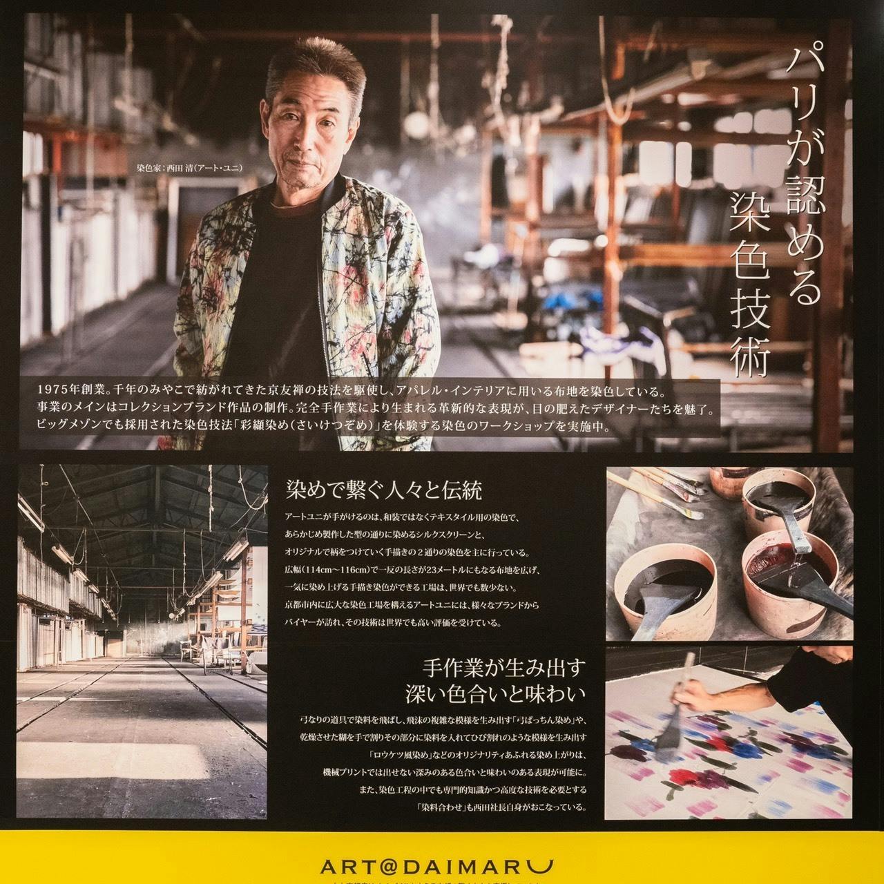 2021/05/28 10:56いつも温かく見守って下さり、ありがとうございます。現在アート・ユニは、5月26日から大丸京都店の全館イベント、ART@DAIMARUに絶賛出展中です。大丸さんの5階下りエスカレーター付近にて、代表・西田清さんのパネル展示や、世界的なメゾンでも採用されたテキスタイルの展示を行っています。展示の中には納品された設備を使った「流彩染め」の作品もあります!また、今回の出展は染色工房〈アート・ユニ〉×〈アフリカドッグス〉のコラボで、出展中のテキスタイルをトートバックやロングスカートなどにお仕立てすることもできます。緊急事態宣言下で気持ちの沈みがちな日々ですが、お近くにお越しの際は、ぜひお立ち寄りください!感染症対策万全で、お待ちしております。出展期間:2021年5月26日(水)-6月22日 もっと見る【ご報告】試作品の経過について