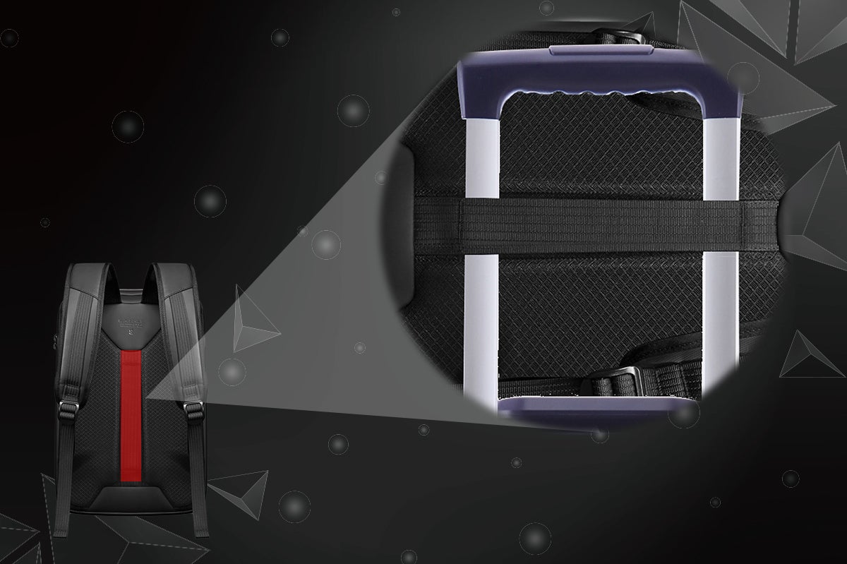 リュックの背部にキャリーケース取り付け用のショルダーを装備。