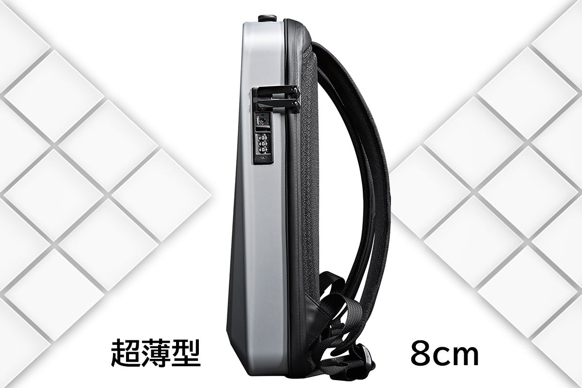 ラッシュアワーの満員電車、バス、街中の人混みのようなシーンを想定して作ったスリムボディー。人の邪魔にならない薄さと機能性を兼ね備えた結果が8cm。