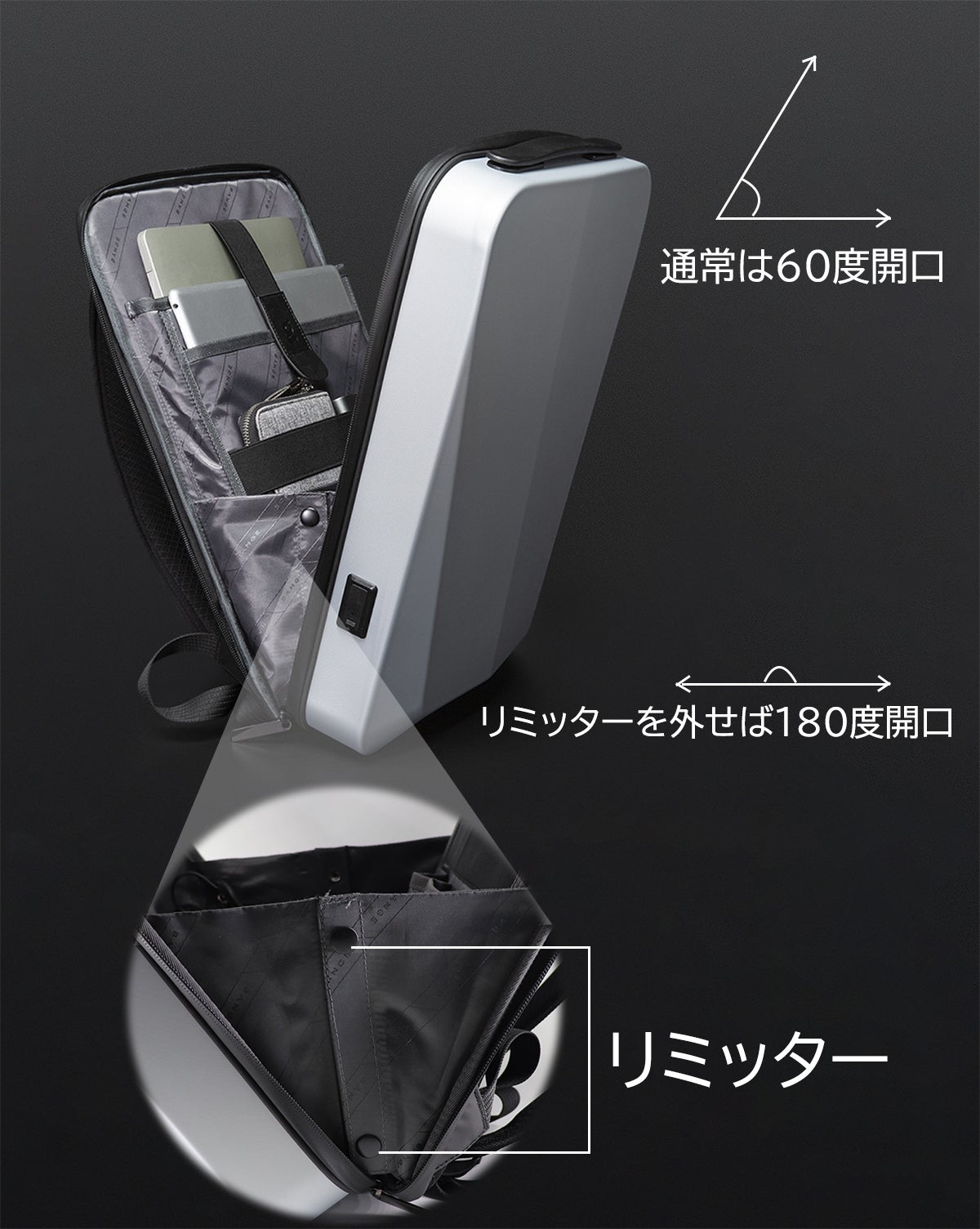 通常開口は60度。付け外し可能なサイドウォール(リミッター)を外せば、リュックを最大180度まで展開可能。荷物の整理や、物の出し入れに大変便利。
