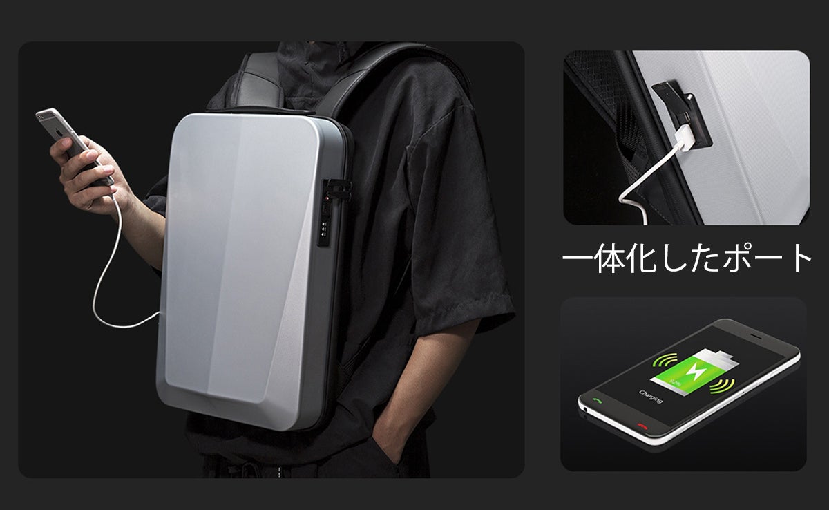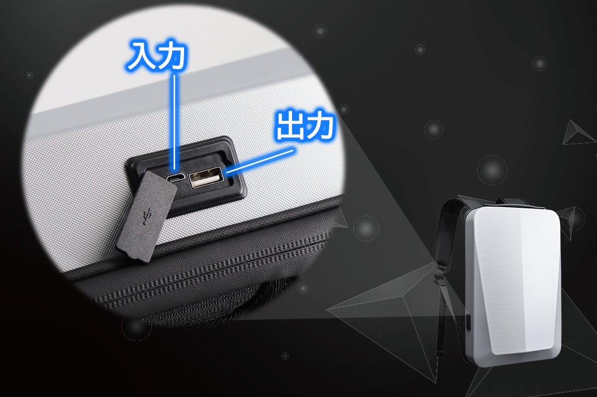 従来のUSBポートは外側への充電のみで、「B&G」リュックは内部のデバイスを取り出さずに充電が可能。例えば外側から内部のモバイルバッテリーやワイヤレスイヤホンを充電することができます。