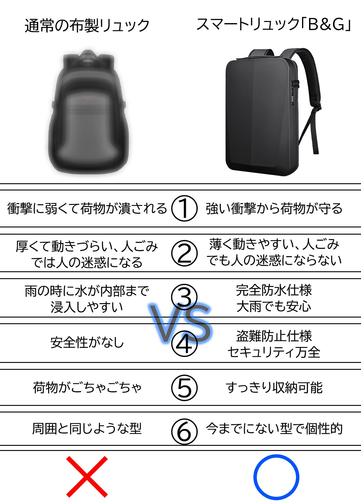 前回は皆様のおかげで、超極薄リュックINVIRUシリーズの初製品の商品化に成功できて誠にありがとうございます。この度は通勤、出張に特化したビジネス用スマートリュックの新シリーズ「B&G」を立ち上げました。そして、新シリーズの第一弾はあらゆる状況から大事な物品を守る超薄型スマートリュック。