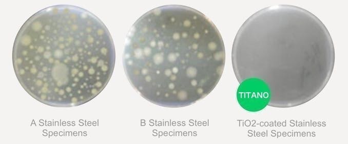 画像を見てわかるように、右端のチタニアでコーティングされた標本は細菌の繁殖がほぼありません。これが、チタンが素材として選ばれている理由の1つです。