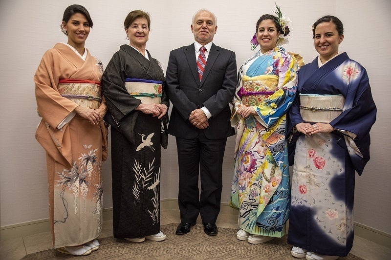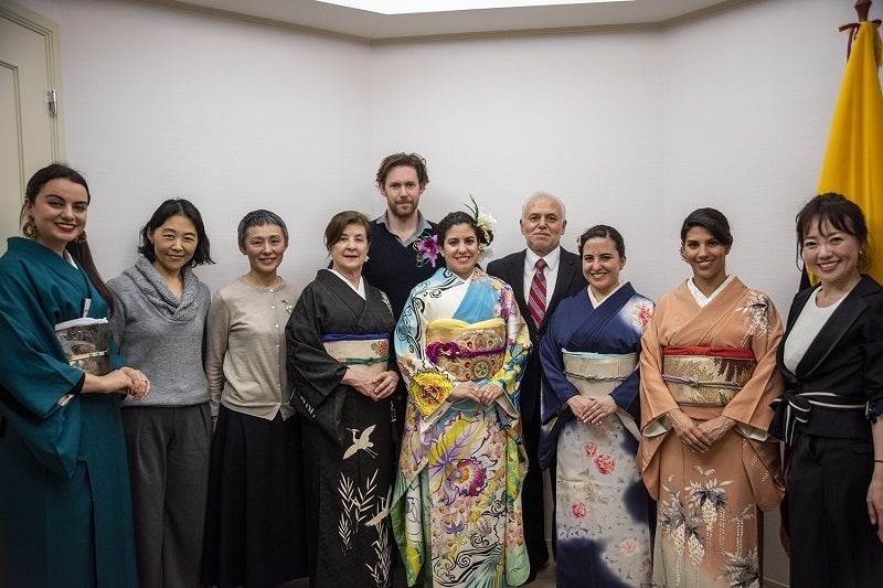 きものが大好きでエクアドルから留学をしているニコルさん(左端)。大使ご家族の着物は彼女が着付けてくれました。