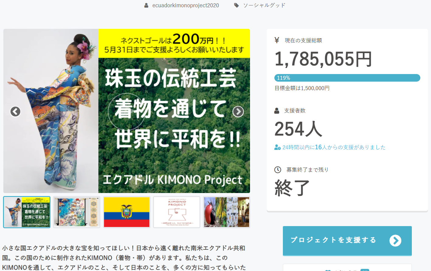 エクアドルのKIMONOの資金はまだ集まっておらず、制作者の方にとっては、ご自身が作ったKIMONOが受け入れられていないのではないかと、もしかしたら不安に思われているかもしれません。素晴らしい国の、素晴らしい着物を作ってくださった制作者の方に、資金が集まったことを、一日も早くご報告できればと思っています。