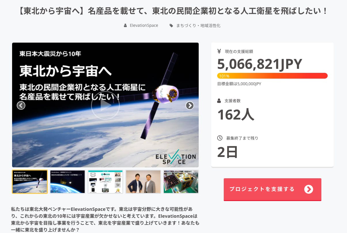 2021/04/21 18:22こんにちは!ElevationSpaceの小林です。いつもご支援していただき本当にありがとうございます。本クラウドファウンディング終了まで残り3日となりました。本クラウドファンディングの目標金額は達成しましたが、人工衛星自体の開発には数億円の費用がかかってきます。そのため、残り期間もご支援していただけますと幸いです。目標金額を超えた分の費用は衛星開発費に充てさせていただきます。東北そして日本の経済に宇宙産業で貢献できるよう精進して参りますので、残り期間も変わらず応援のほどよろしくお願いいたします!!! もっと見る