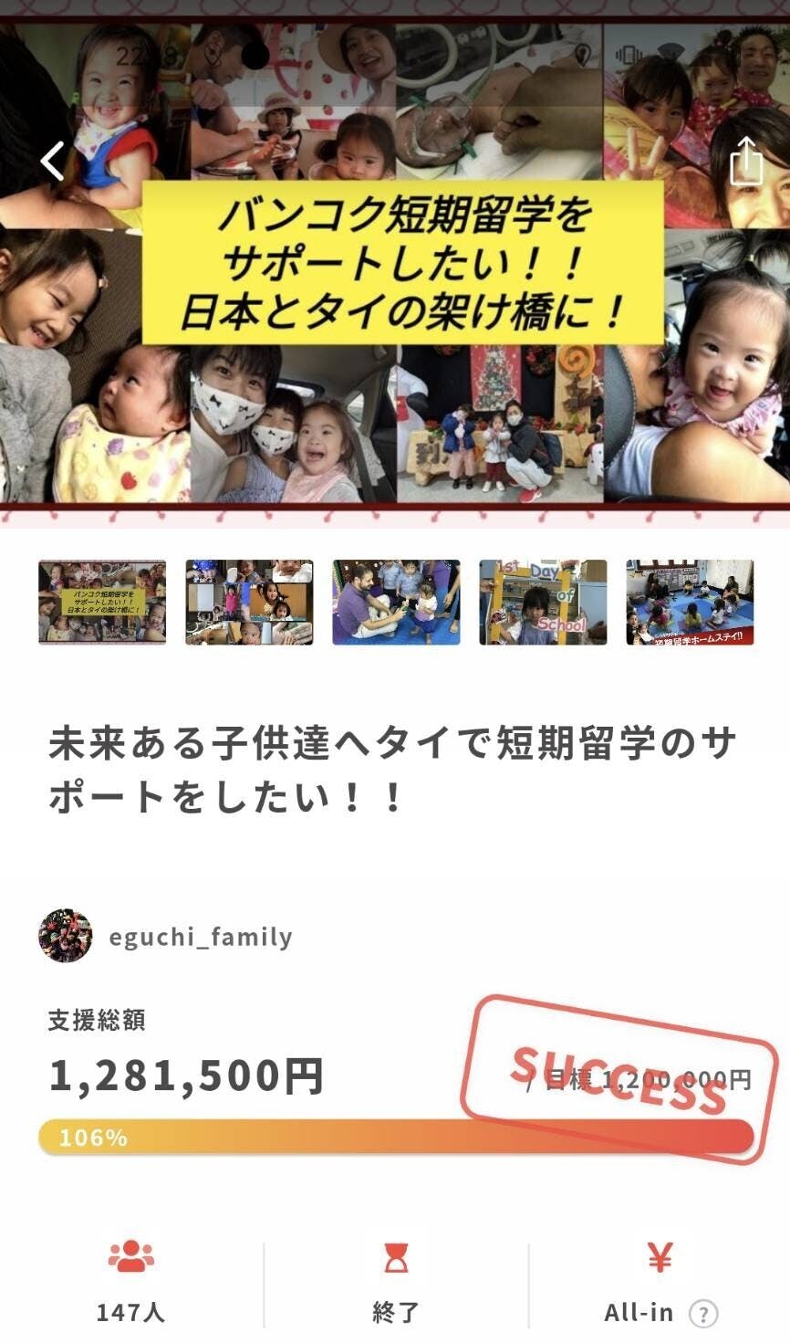 2021/05/13 00:22ご支援者の皆さま先程無事にクラウドファンディング終了いたしました!皆さまのお力添えのおかげで目標達成することができました!ありがとうございます!世界が大変厳しくなった中で、このような温かいご支援に大変感動しております。これからの架け橋になる為に大切に使わせて頂きます!この度はありがとうございました!また6月に返礼スタートさせて頂きますので今しばらくお待ちくださいませ。 もっと見る