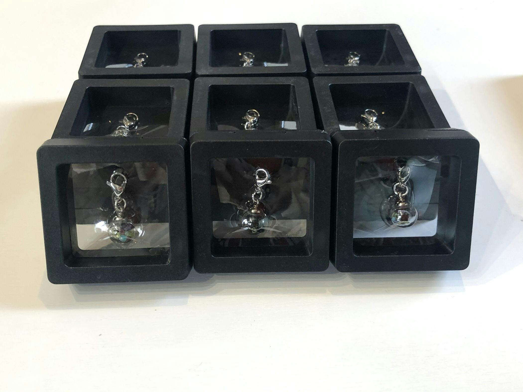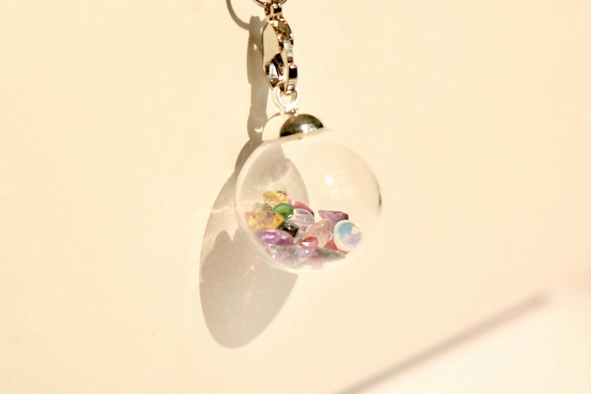 宝石を瓶に入れるだけではもったいない、使いたいけどジュエリーにするのは高額と言う事で綺麗なガラスドームに詰めました。ストラップにしていますので、いつでも宝石を眺める事が可能です。