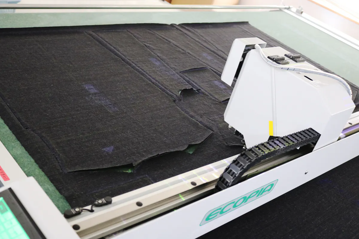 モンスターオンスTシャツを裁断する一枚裁断機。隙間なく配置することで生地を無駄なく使うことができます。