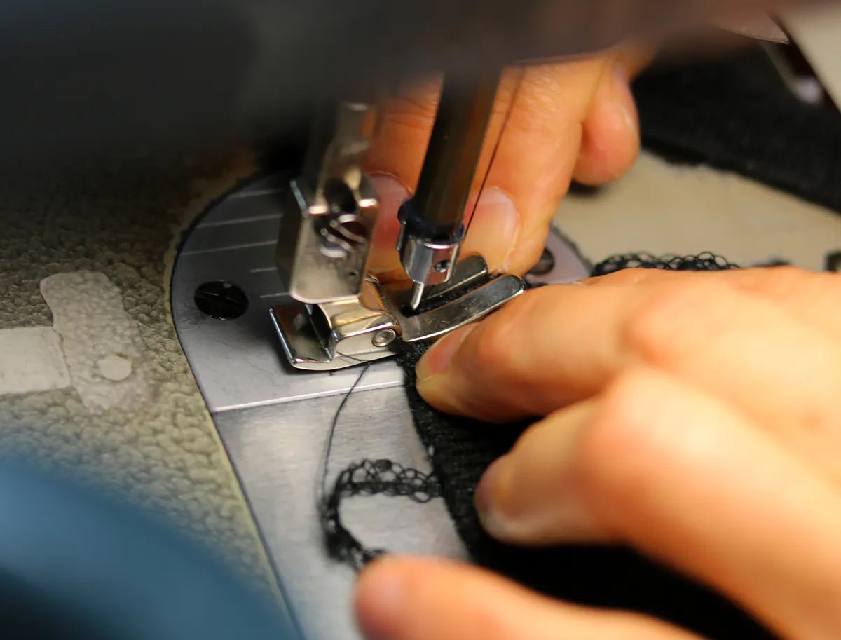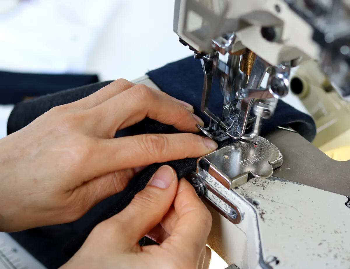 苦労をおかけしている襟パーツの縫製。最も生地が重なる箇所なので針が折れてしまわないよう速度を調整し慎重に進めていきます。