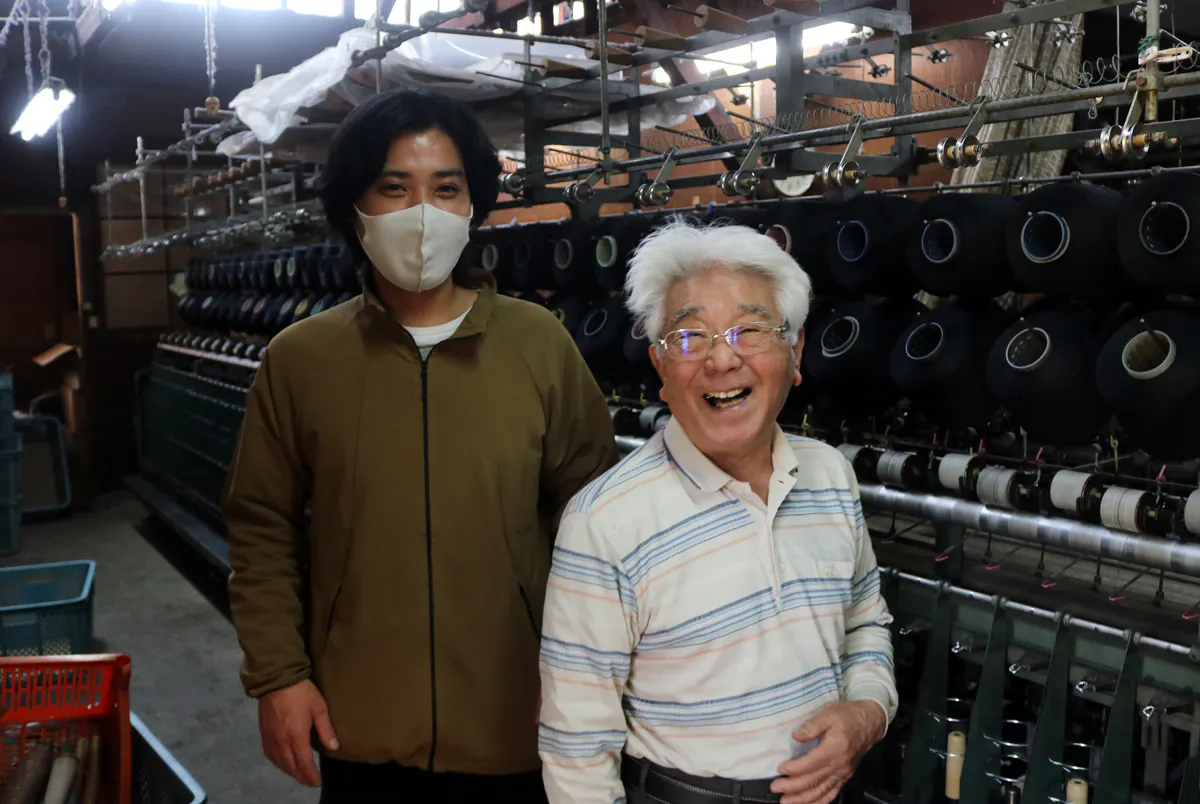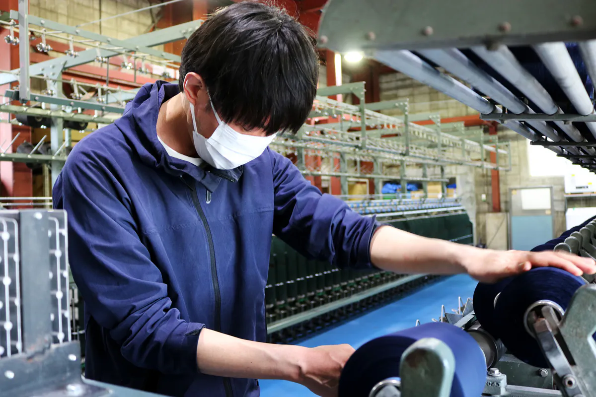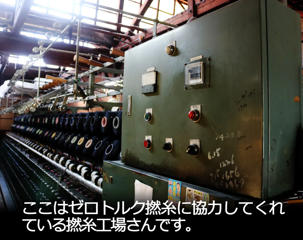 東大阪繊維研究所のTシャツ用の糸は基本的に自社の設備で製造しますが、今回は長引くコロナウイルスの影響で仕事が減ってしまった外部の撚糸工場さんと分業して製造しました。