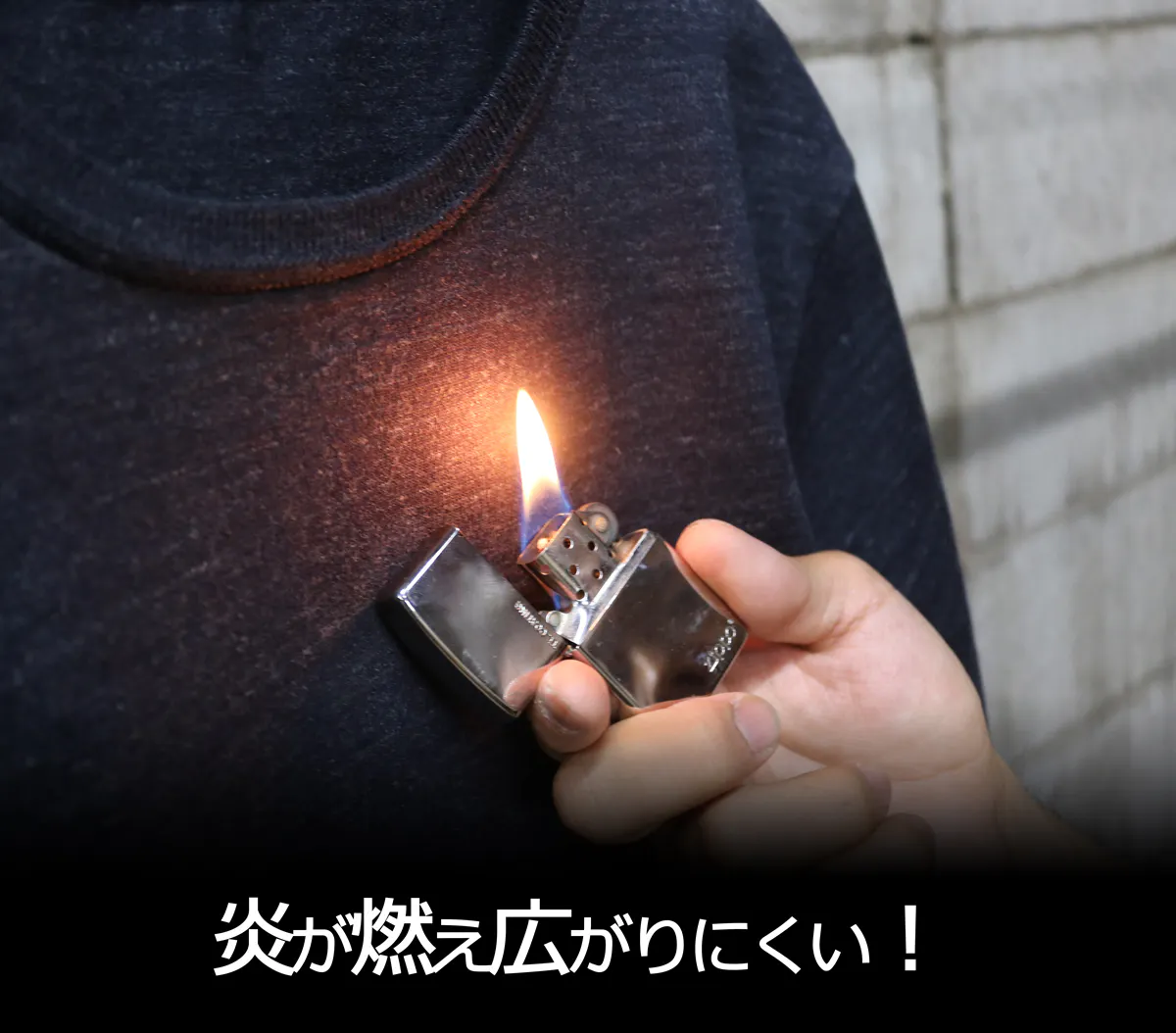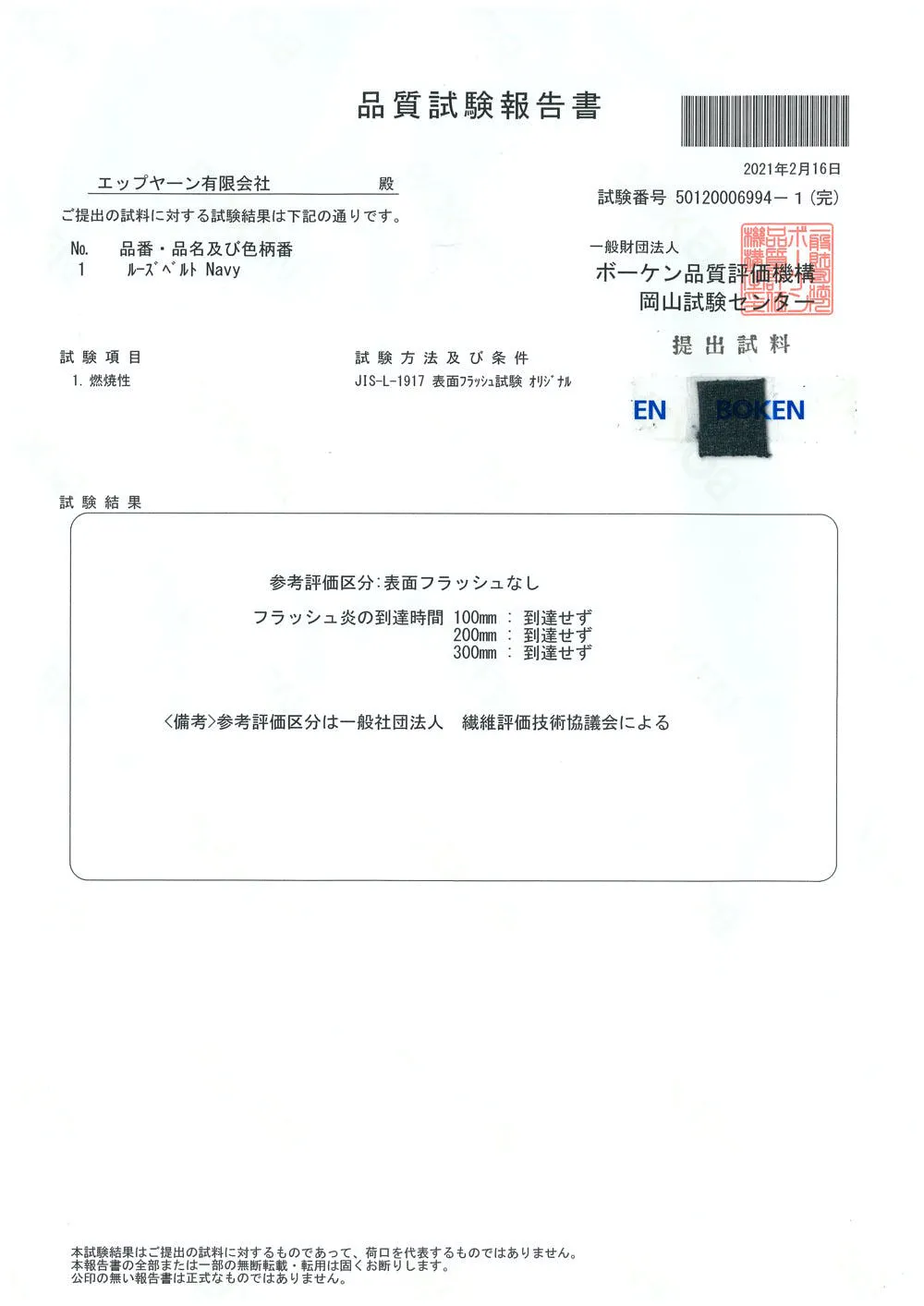 衣類にふれた炎がどのくらい燃え広がりやすいかを調べるフラッシュテストを同じくボーケンで実施しました。テスト結果は表面フラッシュなし!この生地に炎があたっても燃え広がることは無いという試験データが取得できました。