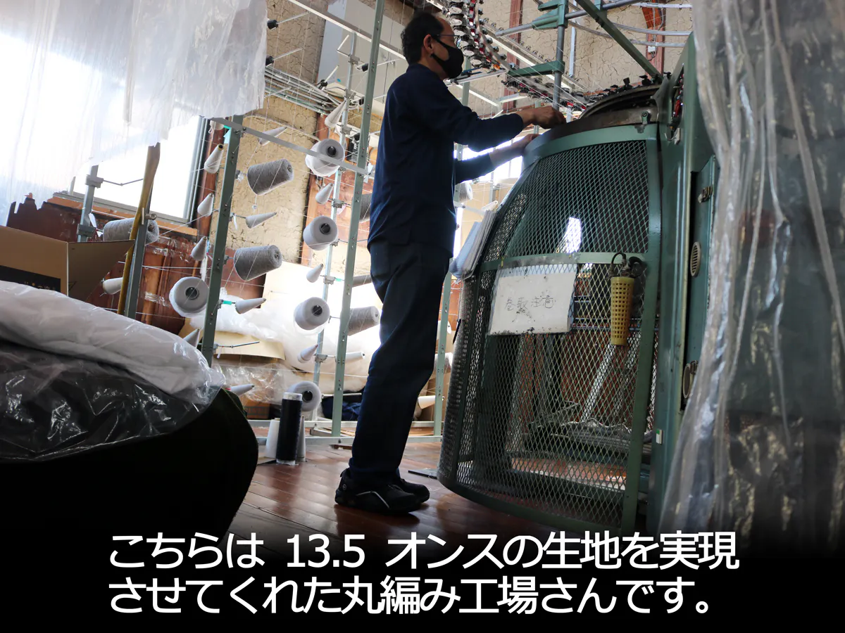 Tシャツとしては極めて厚手の生地作りを依頼した今回の仕事にも嫌な顔一つせず機械の限界まで度を詰めて編んでくれました。