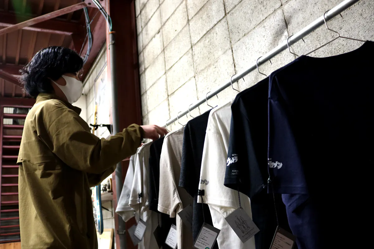 社内にはTシャツの販売スペース「東大阪繊維研究所 works & store」があります。クラウドファンディング公開中はこちらの店舗にサンプルを展示しておりますので、ご来店いただいて実物を見ていただくこともできます。