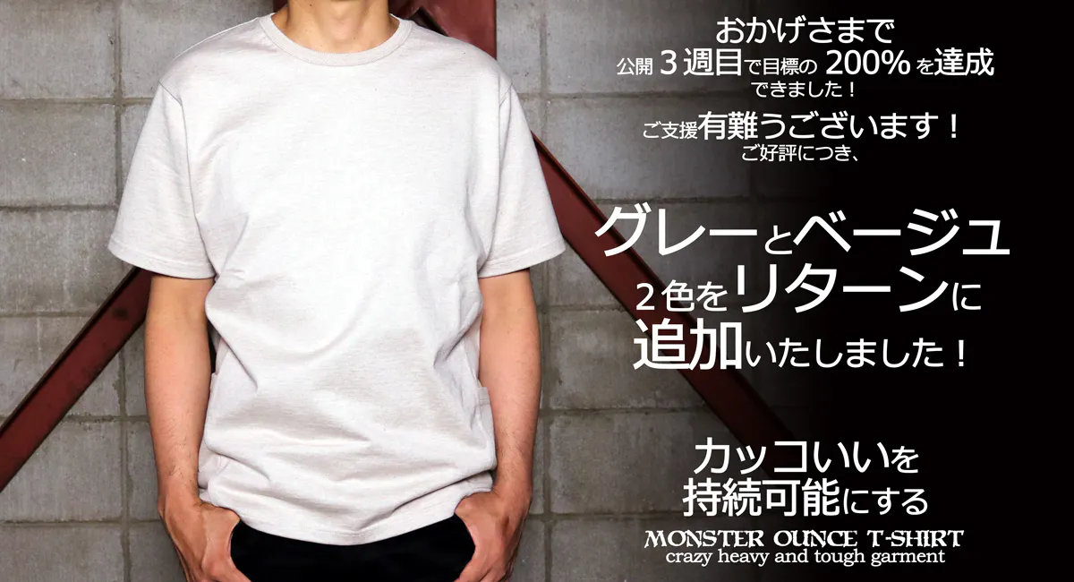 こんなに早く多くのご支援をいただけたことで「これはモンスターオンスTシャツをより多くの方々に着てもらえるチャンスなのかも」と思い、リターンとなるTシャツを2色追加することにいたしました。