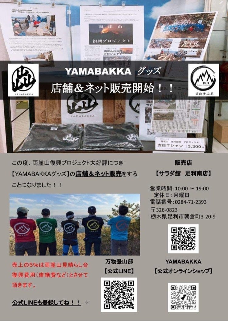 2021/12/02 17:57こんばんは万物登山部です!昨日に続き本日は重大発表第3弾の発表をさせて頂きます!両崖山復興プロジェクト大成功を受け、私たち万物登山部のオリジナルグッズ【YAMABAKKA】の好評につき、この度YAMABAKKAグッズの店舗&ネット販売が開始されました!!店舗販売は地元足利市の 「サラダ館 足利南店」https://shaddy.jp/gs_front/app/shop/shop_introduction/search/tochigi/ashikaga/36460-901/ネット販売は「YAMABAKKA公式オンラインショップ」https://yamabakka.official.ec/是非お買い求め下さい!!※YAMABAKKAグッズの売り上げの5%は両崖山見晴らし台復興費用(修繕費など)とさせて頂きます。YAMABAKKAの公式LINEも登場しましたので是非友達登録お願い致します!!https://lin.ee/saxDS8z もっと見る