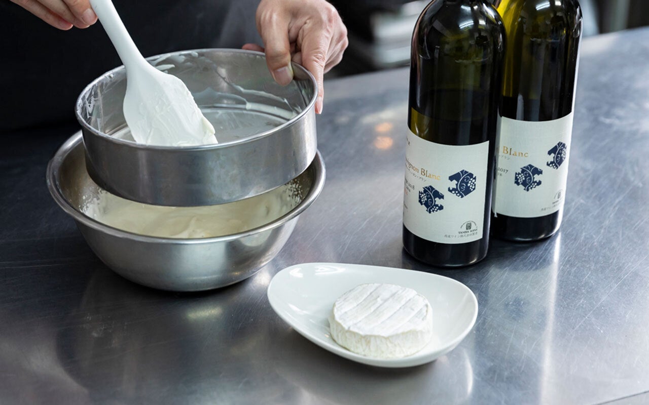 通常レアチーズケーキには使わないカマンベールをベースに使ったのも大きなポイントです。白カビの濃厚な味わい、ほんのりとした塩気が白ワインとマッチすると考え、あえてリンド(固い皮の部分)ごと使用しました。また、なめらかな口当たりを実現するため、カマンベールは丁寧に裏ごし。生クリームは混ぜ合わせる前にふわりとホイップ状にするなど、細部の製法までこだわりました。
