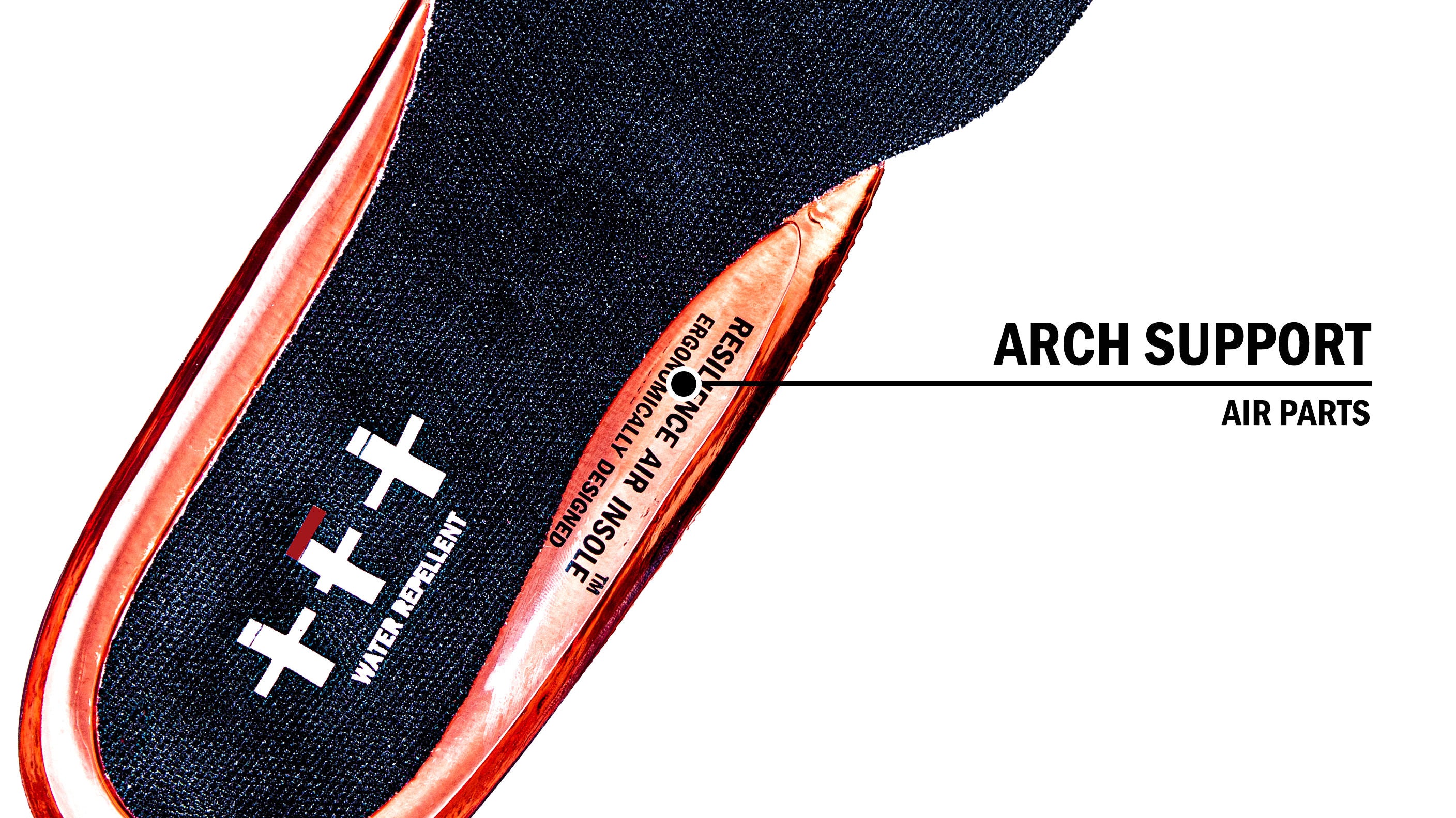 歩行時にエアーパーツが衝撃を吸収し、アーチを支え、かかとから土踏まずにかけてしっかりホールド。膝や腰への負担を軽減する設計になっています。また、素材にポリウレタンフォームを使うことで優れたクッション性も兼備させました。