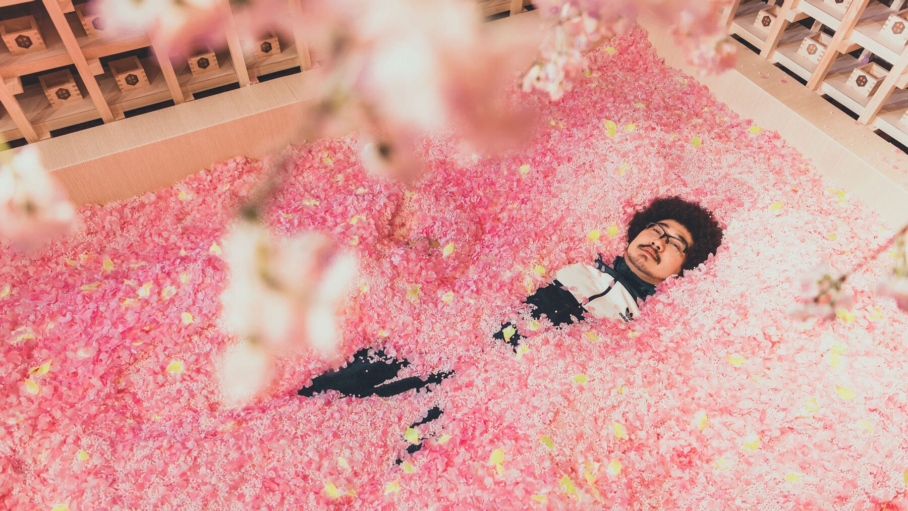 写真は、2018年から開催している、桜舞い散るチルアウトバー「SAKURA CHILL BAR by 佐賀」の桜プールに埋もれている様子です。