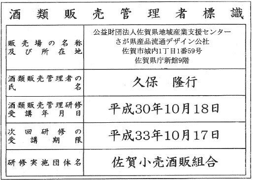 酒類販売業免許 通知書 文書番号: 賀酒指 第218号