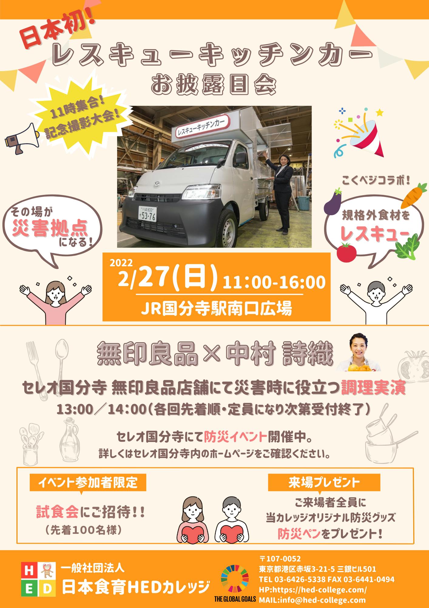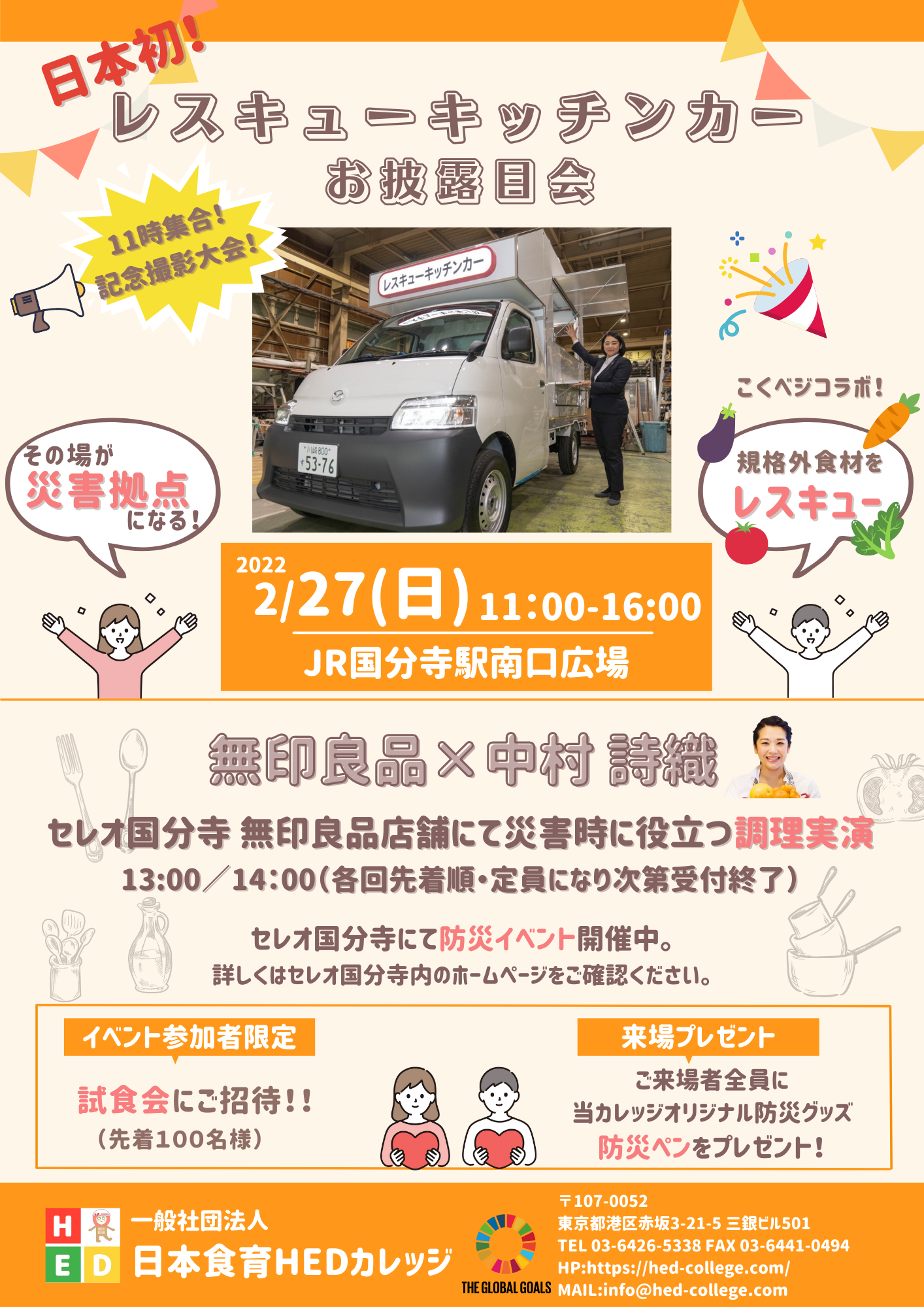 2022/02/16 09:01皆様にご支援頂いたレスキューキッチンカーが遂に!遂に!完成しました!是非、お披露目会へお越し頂けると嬉しいです!●日時:2月27日(日)11:00-16:00 ●場所:JR国分寺駅南口広場※記念撮影をしますので、11時を目指してお越しくださいませ!企画①ご来場者様全員に、当カレッジオリジナル防災グッズプレゼント!企画②ご来場者様全員に、防災食の試食をご用意しております!企画③無印良品と中村詩織がコラボ!参加費無料で暮らしに役立つ防災について学ぶことができます。※申込先着順、試食特典有りご来場お待ちしております!【クラウドファンディング・見学&試食会チケット購入者様へお知らせ】クラウドファンディングへのご支援、本当にありがとうございました!チケットご購入いただいたみなさまには、こくベジとコラボしたおいしい試食を特別にご用意してお待ちしております。コロナ禍により、人数を制限して開催しておりますので、ご参加される方は、以下申込フォームより、登録をお願い致します。※見学&試食会は、これからも何度か開催されますので、今回参加できなくてもご安心ください。【予約フォーム】https://forms.gle/ztERmDzb8DBZrQzXA -----ご来場予定のみなさまへ-----今回、JR国分寺駅直結の商業施設・セレオ国分寺主催の「防災イベント」で無印良品と当カレッジ代表・中村詩織のコラボイベントが開催されます!どちらもぜひ、ご参加ください!-----セレオ国分寺 イベント内容-----【9階フロア】①防災学習プログラム②無印良品スタッフによる紙芝居 【6階フロア】③無印良品店舗による ・災害時に役立つ調理実演 13:00/14:00の2回 講師:中村詩織 メニュー:旬を楽しむ簡単サラダ・モチモチいちご大福①〜③いずれかのイベントに参加して引換券をお持ちの方にはレスキューキッチンカーにて試食をご用意致します。(50組限定)是非、イベントに参加して、引換券をGetしてくださいね!皆さまにお会いできること、心から楽しみにしています!! もっと見る