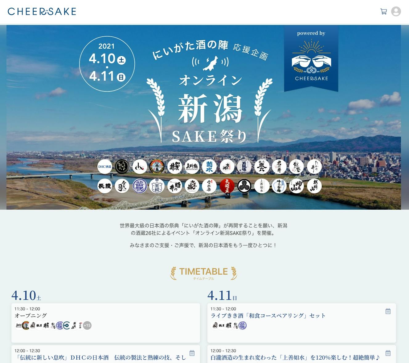 2021/04/08 11:28ついに今週末、皆様のご支援のおかげで無事「オンライン新潟SAKE祭り」を開催できる運びとなりました。2日間にわたるイベントのタイムテーブルなどをご覧いただける特設ページを公開したのでお知らせします。https://cheersake.com/ngtsakefes20212日で合計24回の配信が予定されています。タイムテーブルから気になる配信を探してみてくださいね。気になる配信はぜひご自分のカレンダーに登録することをおすすめします。サイト内でもカレンダーのアイコンをクリックすることで配信の予定をGoogleカレンダーに追加できる機能があります。ぜひご活用ください。当日は特設ページに訪問いただき、ライブ中の配信ページを開くことでライブ配信をご覧いただけます。ライブのイベントのため、急なお知らせや変更がある場合があります。ぜひ公式Twitterアカウントをフォローして、最新情報をチェックしてください!https://twitter.com/saya_cheersakeそして、今回のゲストMCは漫才師の「にほんしゅ」さん!コンビ揃って日本酒きき酒師の資格を持つお二人が、オープニング・乾杯・コラボトークなどでMCを務めます。それでは、皆様のご来場・皆様との乾杯を心よりお待ちしています。イベント開催概要イベント公式名称「~にいがた酒の陣応援企画~ オンライン新潟SAKE祭り powered by CHEERSAKE」開催日時2021年4月10日〜11日• 1日目:11:30〜18:30• 2日目:11:30〜18:30参加方法お時間になりましたら、特設ページから配信をお選びください。https://cheersake.com/ngtsakefes2021ゲストMC漫才師 にほんしゅ• あさやん さん(@asazakeyan)• 北井 さん(@nihonshukitai)主催「~にいがた酒の陣応援企画~ オンライン新潟SAKE祭り」実行委員会協力卸会社新潟県酒類販売株式会社 もっと見る