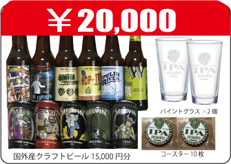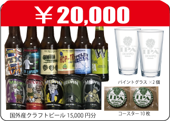 →→国外産クラフトビール 15,000円分、パイントグラス2個、コースター10枚をお送りします。