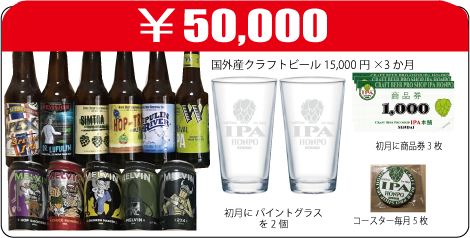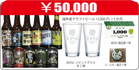 →→国外産クラフトビール 15,000円分×3か月、パイントグラス2個、商品券3,000円分 、コースター毎月5枚をお送りします。