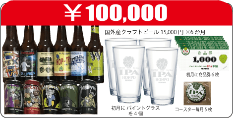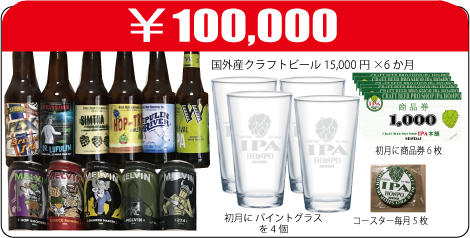 →→国外産クラフトビール 15,000円分×6か月、パイントグラス4個、商品券6,000円分、コースター毎月5枚をお送りします。