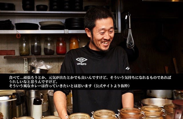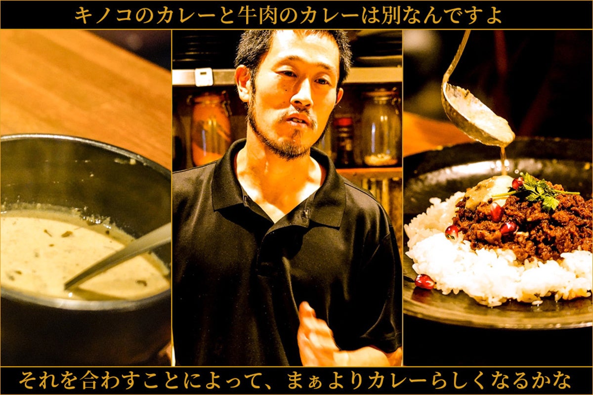 「キノコのポタージュをカレー風にしたらどんな風になるかなって、ただそれだけやったら 弱いかなって思うんで牛肉のカレーを、キノコのカレーと牛肉のカレーは別なんですよ。 それを合わすことによって、まぁよりカレーらしくなるかな」(公式インタビューより)