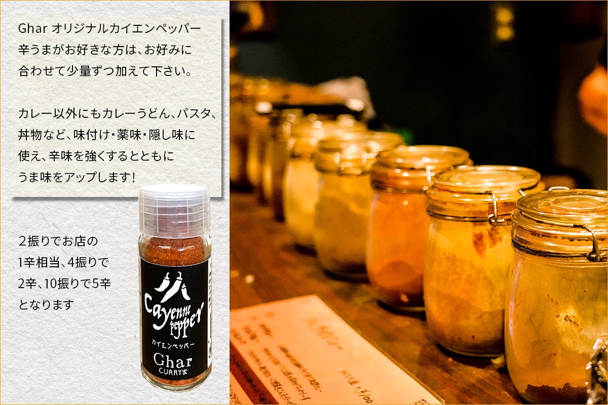 さらにお店の味をできるだけ忠実にお届けしたい、そんな思いからGharオリジナルカイエンペッパーを作りました。