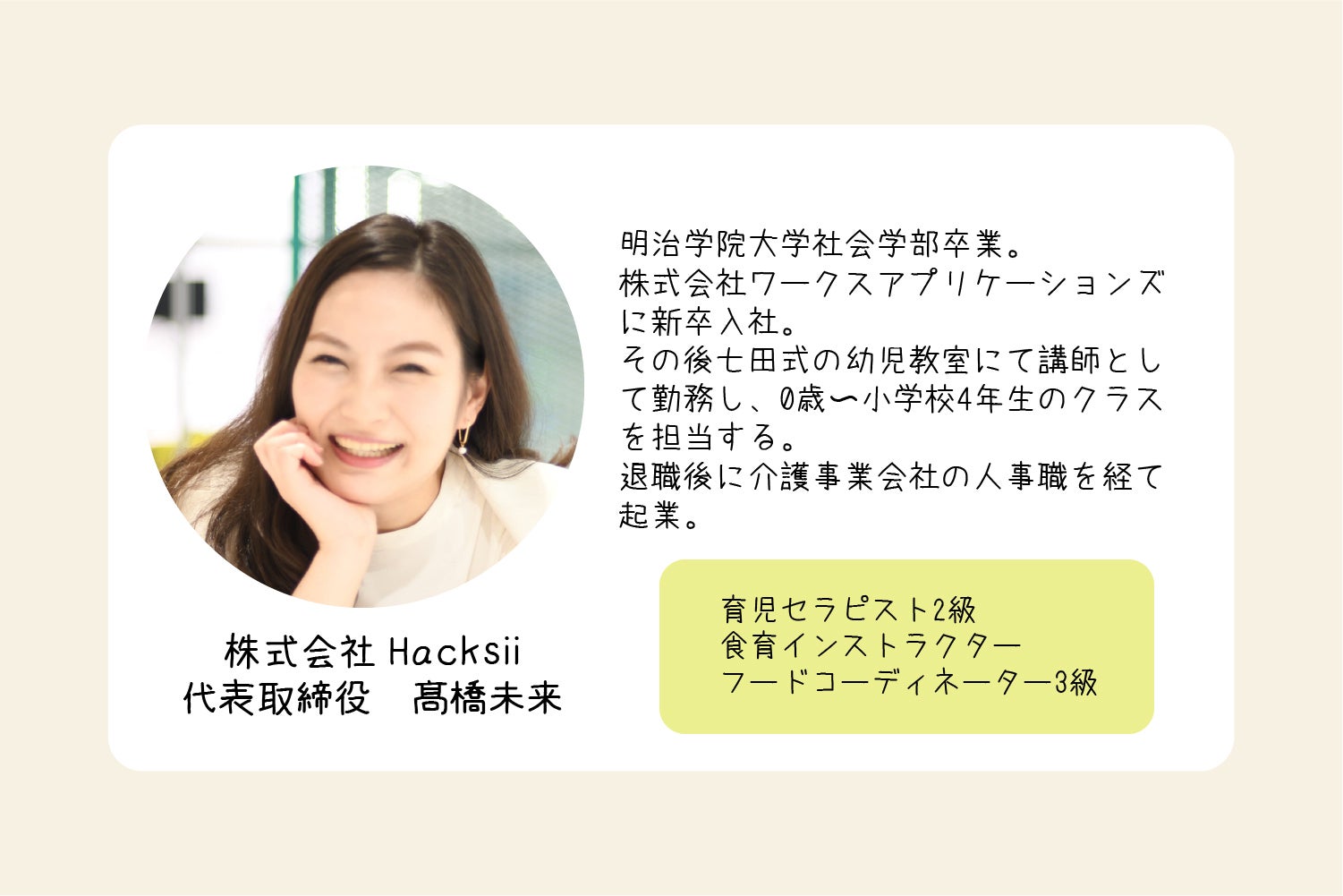 「正解や当たり前に囚われない社会」をビジョンとして掲げる株式会社Hacksiiの代表を務めております、髙橋未来(みく)と申します。