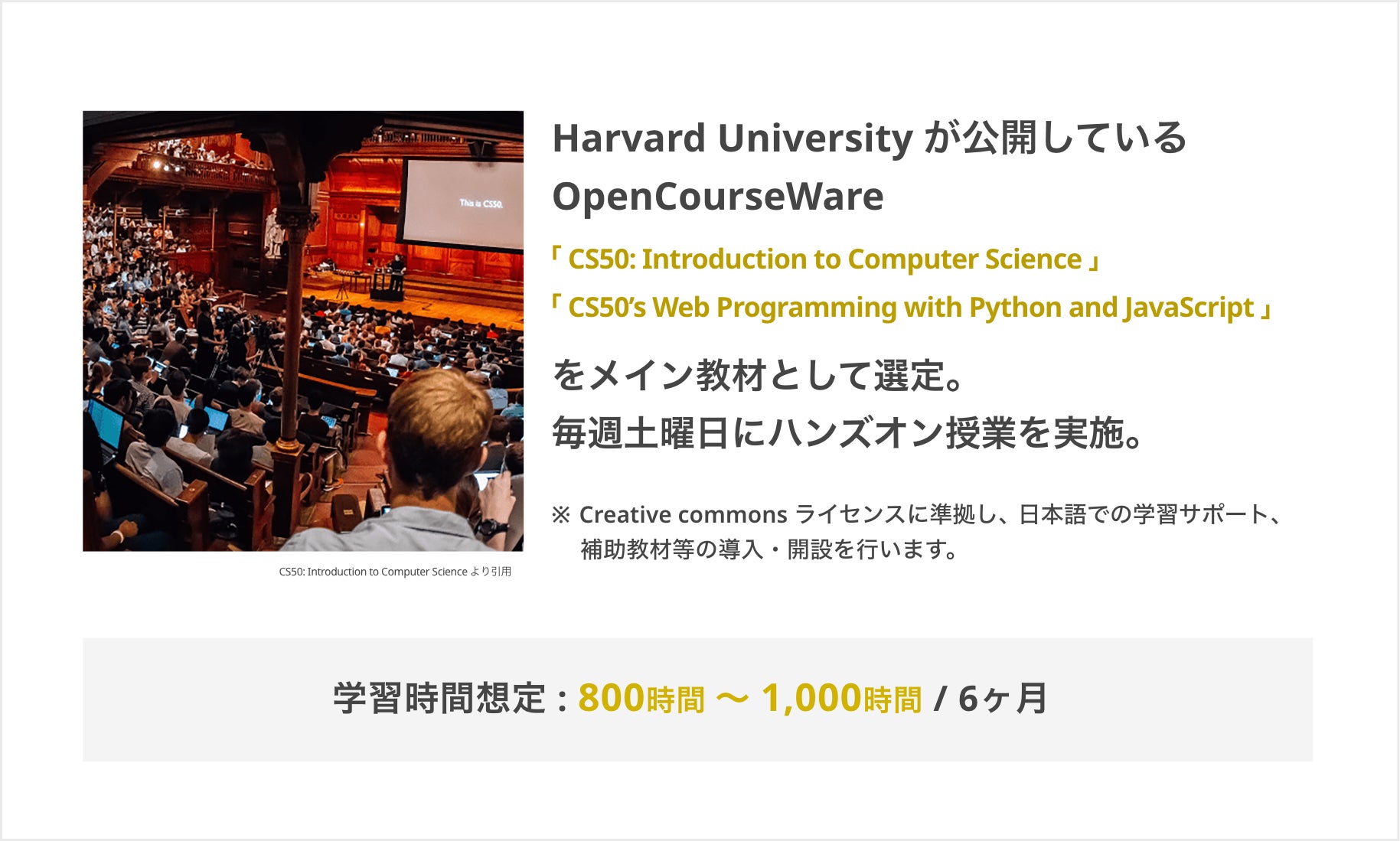 カリキュラムは、ハーバード大学とMITが提供しているオンライン履修サービス「edX」を通じて、Harvard's CS50 から2科目を採用。CODEGYM は、この教材を用いた履修証明取得を支援する上で、日本語での翻訳サポートや、課題等の取り組む上での学習コーチングを行います。