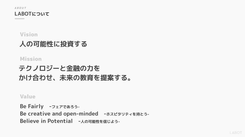 創業者の鶴田は、10代からこれまで数多のサービスを企画・開発し、上場企業へ数億円規模の事業譲渡も経験してきましたが、いずれも数百万人が利用する人気サービスとしての手応えはあったが、社会の仕組みが変えられるインパクトには至らなかった。2009年に上京してから丸10年経ち、28歳になり第一子を授かったことも自身の起業家としての価値観に影響を与え、今回新たに立ち上げた LABOT では、過去7年のスタートアップ2社の成功/失敗の経験、日本の消費行動に変化をもたらしてきたメルカリ社でのプロジェクトマネージャーの経験と、同社のマザーズ上場を目に焼き付けており、これを活かしていきたい。創業からおおむね5年後(2024年)を目標に、店頭市場公開を目指し、10年、20年後にふさわしい新たな価値観を世に提案していきたい。創業事業として手がけるのは、これまで何十年も変化していない「教育」の領域でチャレンジ。子供の頃の夢である「教師」を叶えながら、経営者として次のステージに進みたい。