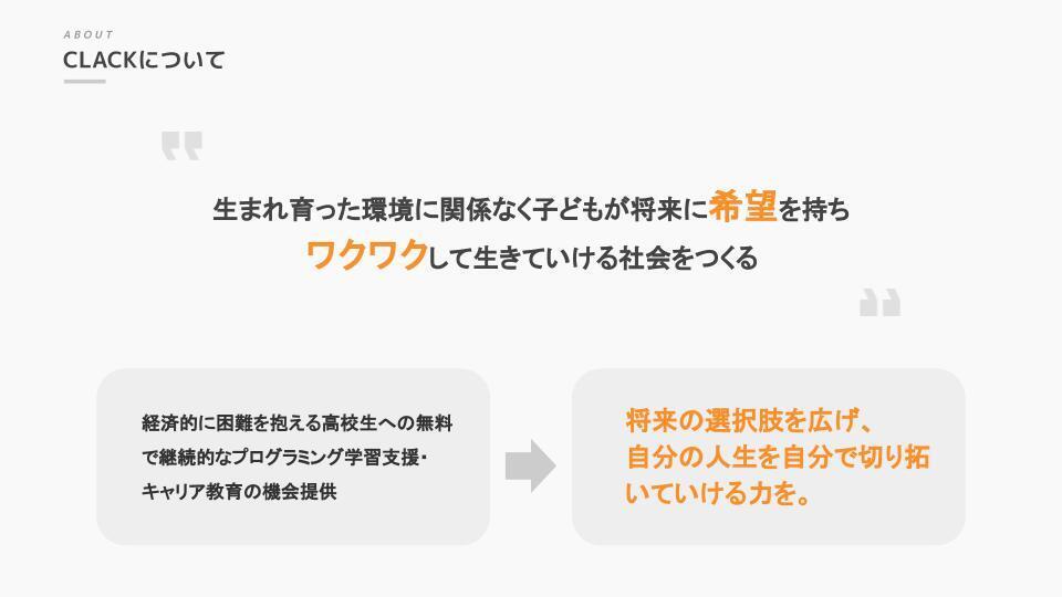 僕がCLACKを立ち上げたのは自分自身の経験があったからです。 僕が中学の時、親の自営業の廃業や離婚があり、そのせいで高校時代にはお金が理由で様々なことを諦めないといけませんでした。自分の家にお金がないこと、ひとり親家庭でしんどい思いをしたことを相談できる人もいませんでした。 それでも、なんとか国公立大学に進学でき、今までできなかった様々なことにチャレンジしてきました。 特に「自分と同じような境遇で今しんどい思いをしている子どもに対しできることはないか」という想いを持って活動したのが「ひとり親家庭の子どもへの学習支援」でした。 活動の中で、生活困窮、虐待、発達障害、いじめ、大人への不信感で苦しむ中高生たちと出会い、少しでも彼ら・彼女らが将来に希望が持てるようになるための手助けをできないかと試行錯誤していました。そうして辿り着いたのが、プログラミングという手段を通した支援です。 対面で継続的に寄り添いながら、プログラミングを学ぶ機会を提供する。まずは少しずつでも自分の将来に希望が持てるように。そして、自分自身で人生を切り拓いていけるように。 何度困難にぶつかっても立ち上がろうと思える「たくましさ」 人の痛みがわかり人に寄り添える「やさしさ」 彼ら・彼女らが、そんな「たくましくてやさしい人」になり、同じようにしんどい思いをしている子ども達の等身大のロールモデルになってもらえたらと願っています。 CLACKでは、そのために必要な これからの時代で不可欠になるITテクノロジーの素養を身につける「プログラミング教育」 身近なロールモデルに触れ、自分の進みたい道を模索する「キャリア教育」 によって伴走して行きます。 今の世の中、まだまだチャンスは平等にあるとは言えません。経済状況や環境によって、CLACKが対象とする生徒は、他の子どもよりチャンスは少ないのかもしれません。 しかし、今の日本は多くの人の努力によって、お金や繋がりがなくてもチャンスへ取り組める場面が増えてきています。だから、そのチャンスが来たときに、まず生徒たちがそのチャンスに気づき、そしてそれを逃さず掴めるようにCLACKはサポートしていきます。