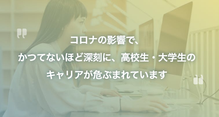 COVID−19の影響を受け、学生の学習環境は変化をしています。そんな状況であってもプログラミング学習を通じて自ら未来を切り開いていく力を身につけて欲しいと思い「新型コロナ緊急学生キャリア支援プロジェクト 」を開始しました。 自ら未来を切り開こうとする学生を後押しをする仲間になってください。