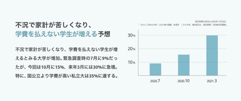 新型コロナウィルスの影響により本人もしくは両親の経済的な状況の変化が学生の学びやキャリアに影響を与えています。また、オンライン授業など学び方が変化し、そのあり方が問われています。