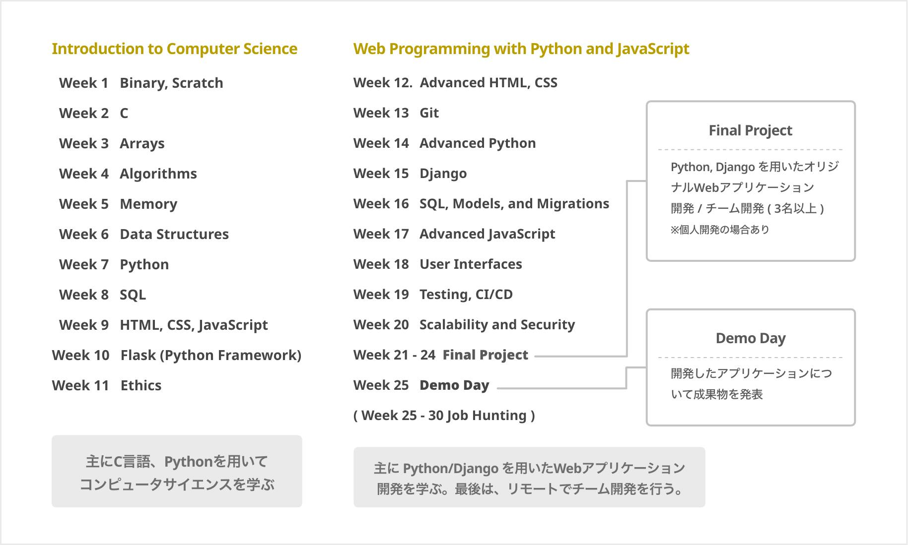 カリキュラムは、ハーバード大学とMITが提供しているオンライン履修サービス「edX」を通じて、Harvard's CS50 から2科目を採用。CODEGYM は、この教材を用いた履修証明取得を支援する上で、日本語での翻訳サポートや、課題等の取り組む上での学習コーチングを行います。