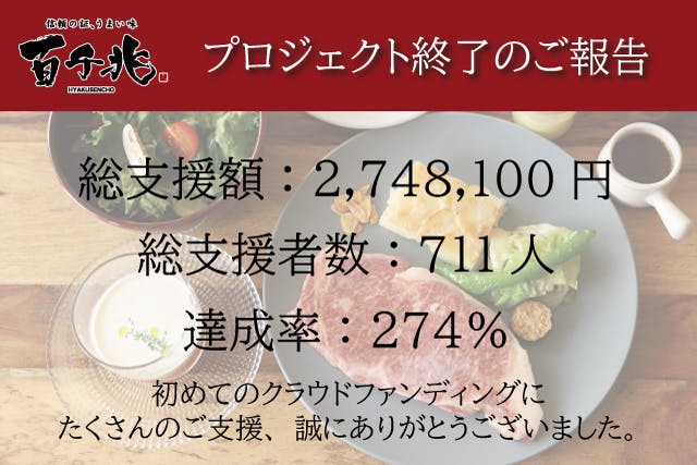 2021/05/10 18:30この度は百千兆、はじめてのクラウドファンディング、「和牛で腹いっぱいのプロジェクト」 に参加&ご支援頂き誠にありがとうございました。皆様の暖かいご支援のおかげで、当初目標100万円、ネクストゴール200万円を超えて達成率270%以上という結果でプロジェクトを終了がすることができました。何よりも当初の目標である「たくさんの方に安くて美味しい和牛をお届けしたい!」という気持ちが、711名の多くの支援者に伝わったことがとても嬉しく思っております。本当にありがとうございました。支援金につきまして1円足りとも無駄にすることなく、皆様に今後も美味しい醸成和牛をご提供できますよう努力させていただく所存でございます。5月12日より順次ではございますが、リターン品の発送をスタートさせていただきます。従業員一同、皆様のご期待にお応えするべく、真心を込めてリターン品の発送準備いたします。商品到着まで今しばらくお待ちください。3週間程の本プロジェクトを応援していただき本当にありがとうございました。また機会がございましたら、店頭やCAMP FIREで皆様に再開できますことスタッフ一同、楽しみにしております。 もっと見る