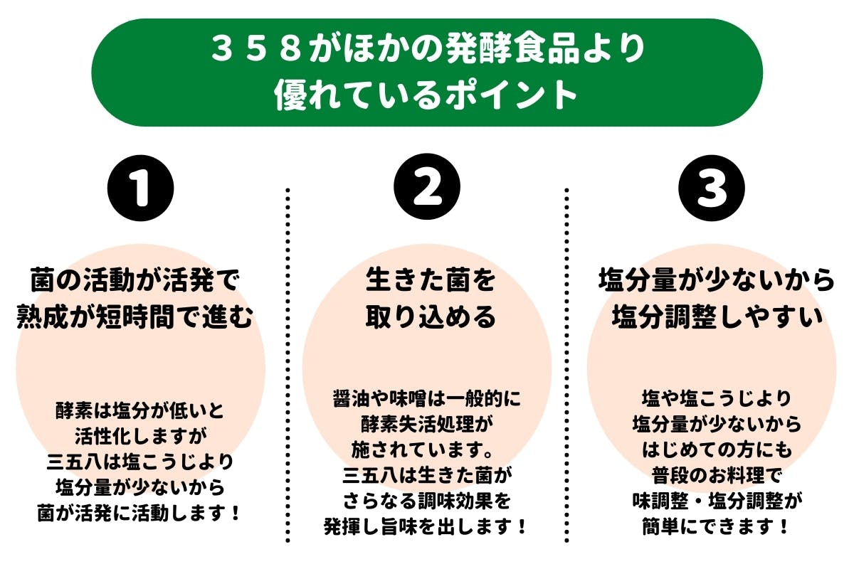 358ファンです! 万能調味料として358を使わない日はないです。358はお米、麹、塩のみでできていて、安心安全の調味料です。日本の大切な発酵食品です。お魚、お肉、お野菜と食材を選ばず、358で味付けすると旨味と深みが増して本当に美味しくなるのです。わたしは塩の代わりに358を使っています。(もう塩はほとんど使用していません) また食材自身の栄養価をあげ、保存性も増します。 そして、358には麹菌をはじめ菌が豊富に含まれています。 腸内細菌の善玉菌の働きを助け、腸内環境の改善に役立ちます。腸活調味料としても活用できます。 是非、皆さんも358を召し上がってみてくださいね。