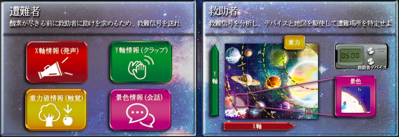 宇宙に遭難した「遭難者」と、母艦に残った「救助者」に分かれて協力して遊びます。