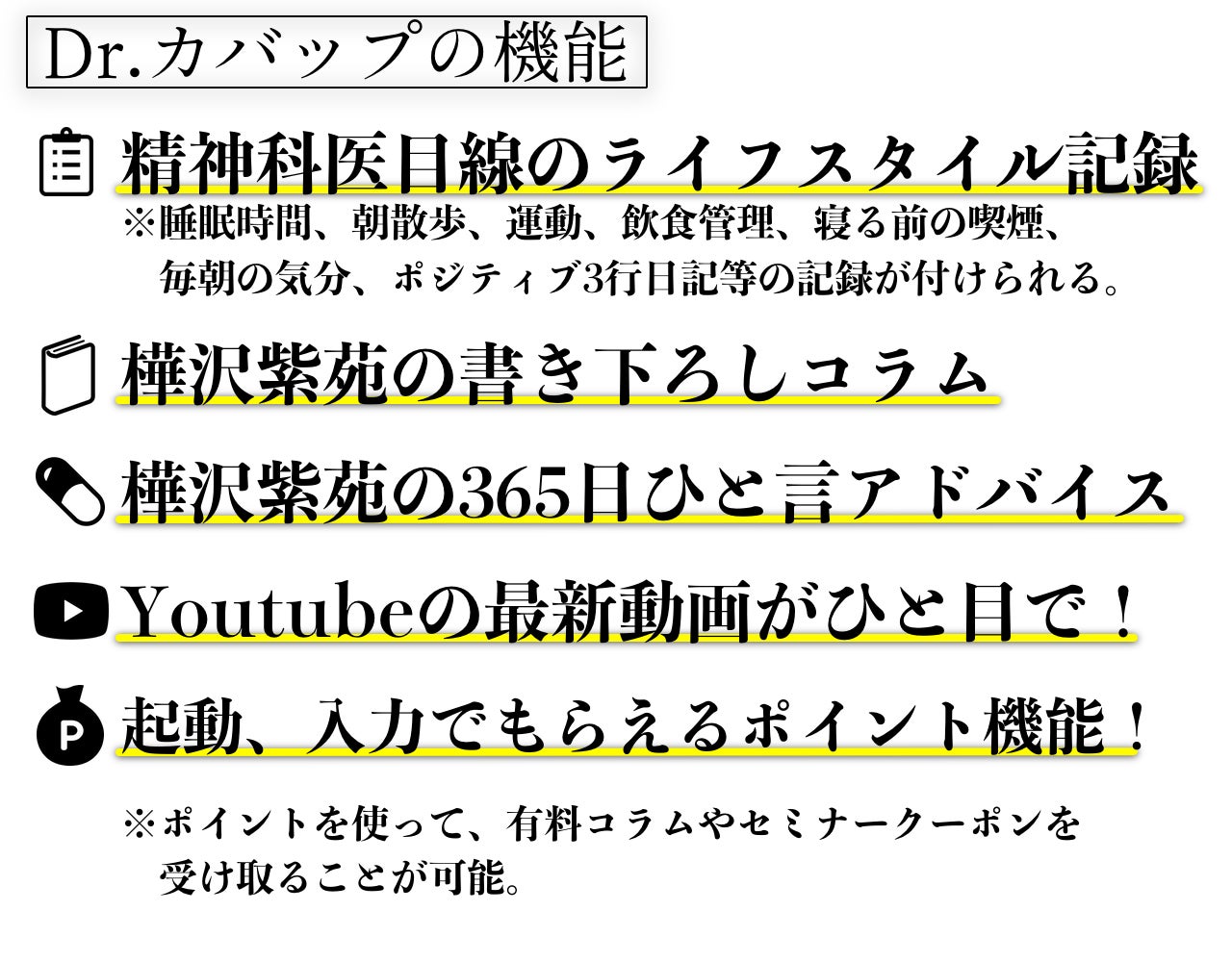 他にもライフスタイル改善ツール及び、アプリはございますが、精神科医としての「心と身体の健康」「パフォーマンスアップ」のベストアンサーを実践するための機能をこのアプリに詰め込んでおります。