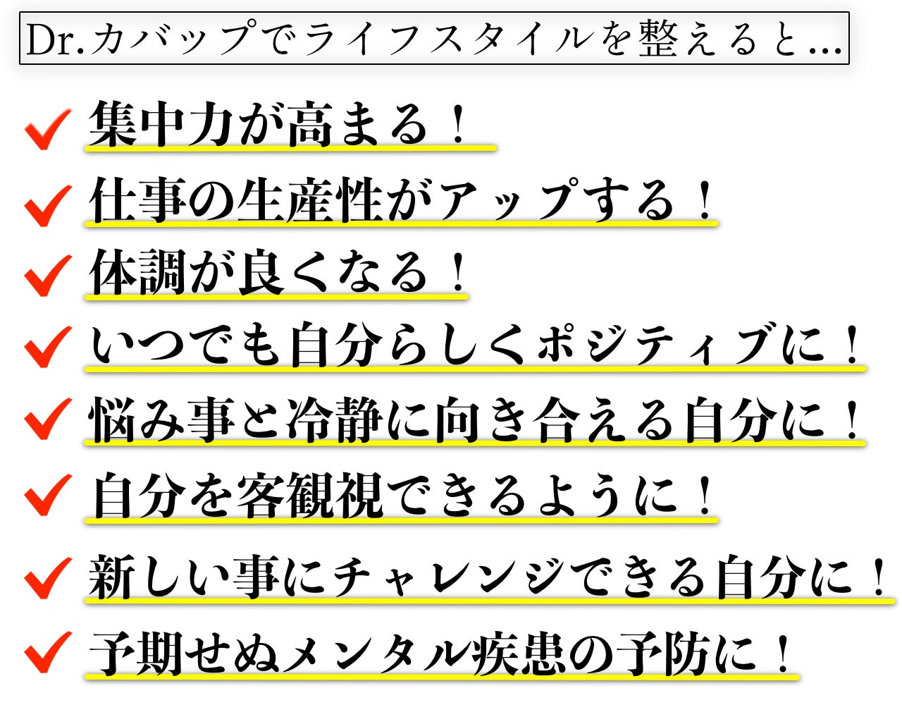その実践を手助けし、一人でも多くの方のライフスタイル・ワークスタイルの向上を実現し、世の中の健康とパフォーマンスアップに貢献したいと思い、「Dr.カバップ」というアプリを作りました。