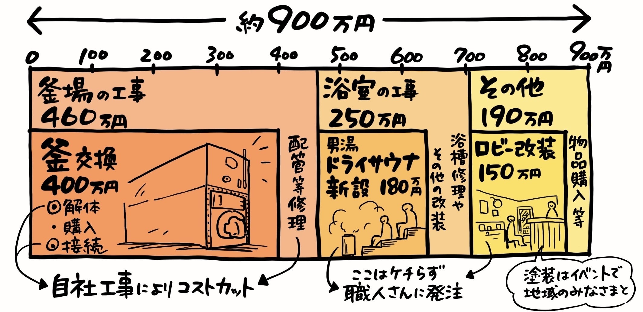 人蔘湯復活にかかる費用は約900万円にのぼります。この金額を投じてでも、人蔘湯は残す価値があると判断しました。